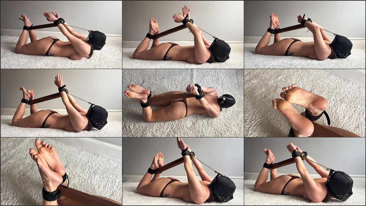 This clip focuses on hogtied bondage, struggling, barefoot, feet, soles, leather cuffs, hooded, harness ballgagged, and a strong foot fetish theme throughout.