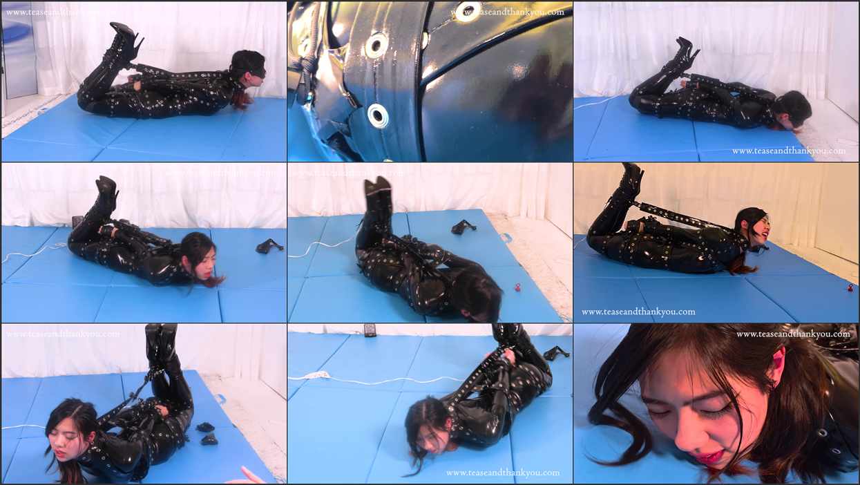 A cute custom request for a tight PVC centric hogtie and escapology. All you have to do is pick that key up, Sylvie. Over there… No. The other way. Sorry, I forgot you’re blindfolded.
