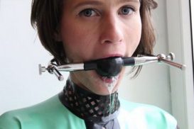 Justine with her Legs Locked in the Stock, Hands Cuffed to the Stock and a Ball Gag