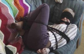 Belle gets placed into her first super tight ball tie while completly naked, blindfolded and muzzle gagged