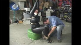 Caught snooping & tied crotch roped, gagged and spread legged,in latex clothing. Submissive JJ Plush bound