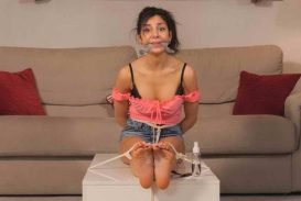Lara – Two hard challenges Part 1, hogtied by her elbows to her ankles
