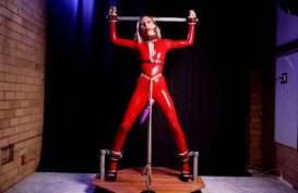 Foxxy in Red Latex Vibed on the Bondage Stand, Showsomerestraint