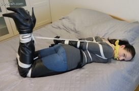 Kim cuffed, roped and gagged in pantyhose and boots, bondish