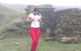 First Tracey walks on the moors dressed in red spandex pants and a clingy white tee shirt and with her hands cuffed behind her back