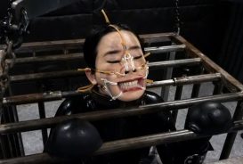 Latex-clad Japanese Girl Gets Locked in a Cage and Has Her Dumb Face Stretched Out by Facehugger