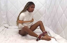Busty Cleo is trying to get comfortable, hogtied