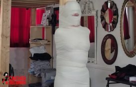 Sandra Silvers cocooned and strapped – Extreme On-Screen Multi-Layer Encasement Bondage for MILF Slave