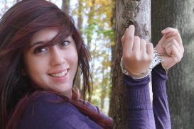 Teen Cera cuffed to a tree