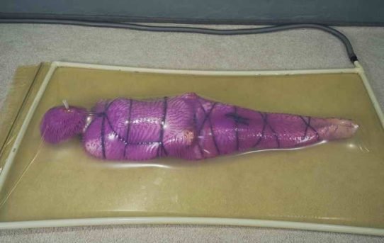 Sonya – Inflatable mattress bondage in a transparent vacuum shell, Vacuum Dreams