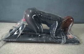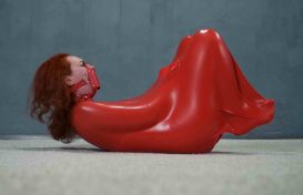 Sonya – Inflatable mattress bondage in a transparent vacuum shell, Vacuum Dreams
