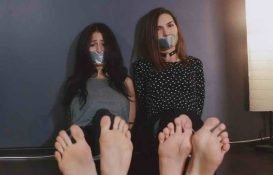 Charlotte Stokely and Sara Liz Sat Securely Trussed On A Green Carpet, Both Naked And Cleave Gagged