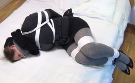 Сandid wool bondage: Lara hogtied in street clothes