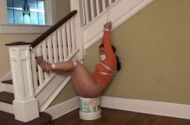 Gagged, Grabbed & Bound to Stairwell in Hose & Sweater