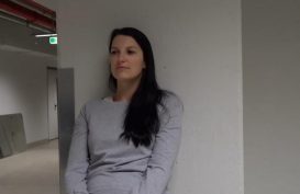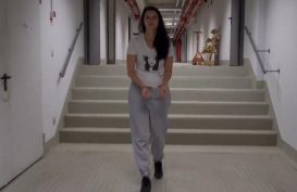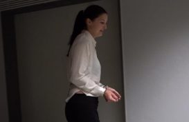 Nina arrested in business clothes, cuffed with legirons and handcuffs