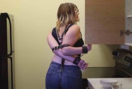 Juniper has a hard time cleaning the kitchen with her arms bound behind her back, jbroper