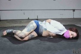 Tattooed Krysta Kaos Belt Bondage Escape Challenge, Stapped in a hogtie