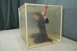 Sonya – Bondage with red ropes to a transparent cube, Vacuum Dreams