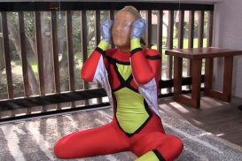 Rachel Adams tape bondage latex hood, swimwearbondage