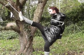 Pantyhose bondage experiment with Lady Renee: Anna hogtied in boots, bondish