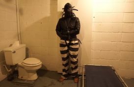 [straitjacketed] Ariel Anderssen Hooded and Straitjacketed [leather hood, frogtie]