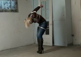 Bondage Goddess Rachel Adams Tied in Jeans, Black Leather Gloves and Knee Boots