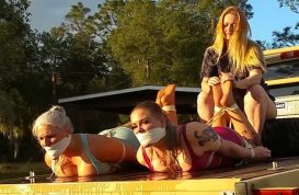 2 MILFs Sandra Silvers and Caroline Pierce Bound on the Bed for Satin Pyjama Party Foot Tickle Torment