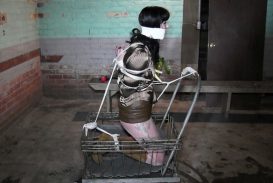 Corrupt security guard leaves the slender beauty Nyxon with panties on her head and in her mouth, chair tied
