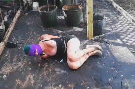 Natalie Charm – Cruelly hogtied in her LBD out in the garden, jimhunterslair