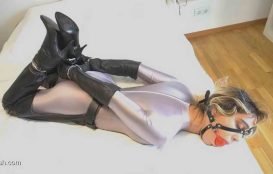 Pixie – Hogtied with handcuffs and gagged in chapboots, bondish