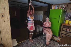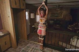 Mandy Wolf – Slender blonde captive tied to a pole with one leg stretched high in the air, jimhunterslair