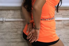 Prisoner Alissa cuffed with high security cuffs and leg ironed