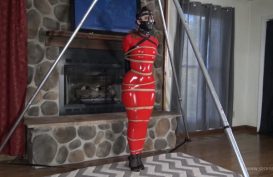 Tracey Lain in black shiny PVC clothing hogtied, gagged and blindfolded, chimerabondage