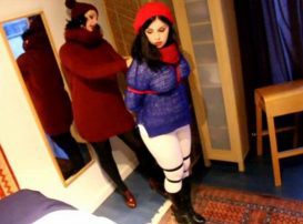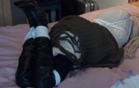 Maria in leather boots hogtied and gagged in wool turtleneck dress and tights