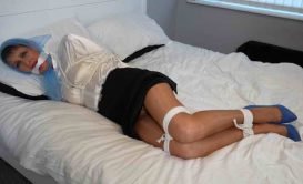 Satin bound Sarah, bound and gagged with her satin scarves by intruder, Muffled Screams