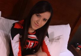 Cheerleader Jazzy self cuffing in handcuffs and ankle cuffs