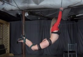 Bettine standing tied, tortured in the dungeon