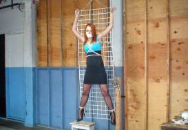Gia Haze – Hapless girl left hanging upside-down by her boots in the Hunter’s basement, jimhunterslair