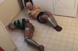 Sandra Silvers & Vivienne Velvet Tape Bondage, Pantyhose Peril when MILF Roommates Are Duct Taped in the Laundry
