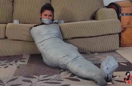Pandora Paramour – Mummified in Duct Tape on the Futon, wrappedinbondage