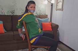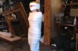 Zoey Ziptie – Hot blonde club girl wrapped in tape, breast bound, hogtied for bound orgasms, jimhunterslair