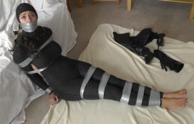 Sexpot Sadie Holmes in leather boots self bound and gagged