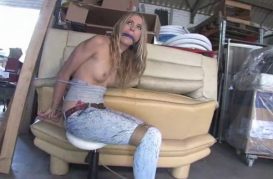 Naked Blanche hogtied hard, rope gagged, tit-grabbed