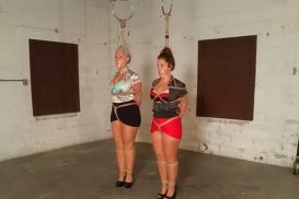 MILF Secretaries Sandra Silvers & Constance Coyne Wrap Gagged, Crotch Roped, Hoisted by their Tied Hair
