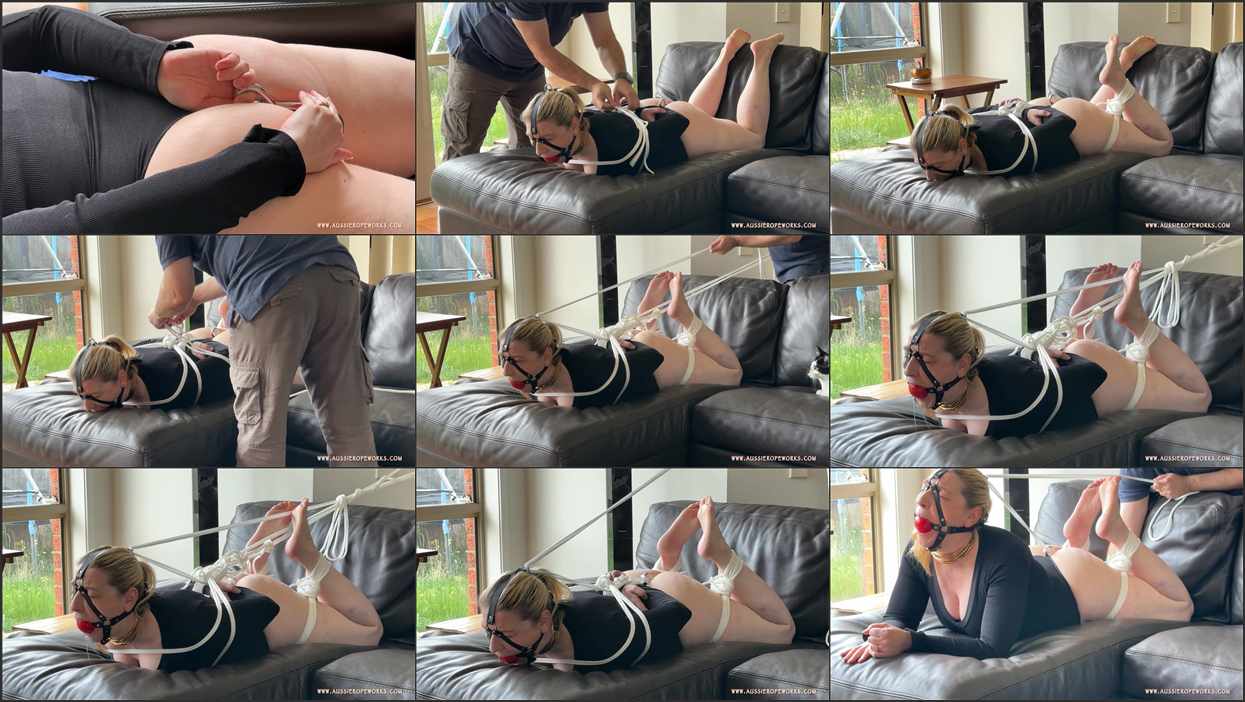 Footsteps echo, deliberate and heavy. He steps into view, his gaze intense. Without a word, he crosses my arms behind my back, looping rope around my wrists, pulling until they’re snug. My shoulders strain, but the restriction feels right. He crosses my legs next, bending them so my heels press against my thighs, and ties them tightly. The position is demanding, my body taut, but he’s not finished. He threads rope across my chest, over the bodysuit, and pulls it back, securing it to a point behind me—maybe a wall hook. My torso lifts, spine arching, the tail hook shifting inside me, sending a jolt through my core…