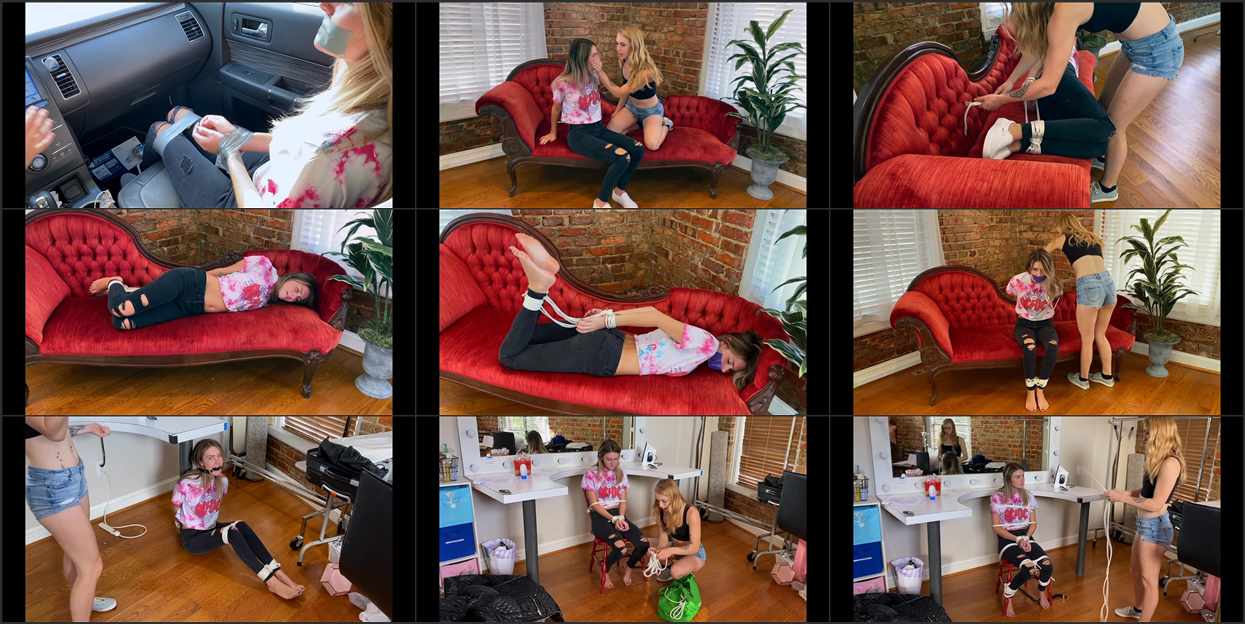 London Evans realizes she forgot something in her car and heads back to the parking lot alone. She slides into the front seat, rummaging through the glove box, completely unaware of the figure crouched in the back. A hand clamps hard over her mouth. Before London can scream, Macy Nikole is on her wrists yanked behind her back and wrapped tight with sticky silver duct tape while the muffled protests pour out. Macy leans in close: “You shouldnt have tailgated me earlier, sweetheart. Now you’re coming with me. London is dragged from the car and bundled into Macy’s apartment. In minutes she’s face-down on the living room sofa, still in her casual jeans and top, locked into a vicious hogtie wrists and ankles roped securely, layers of duct tape pulling her into a deep arch, more rope sealing her knees until escape feels impossible. A final wide strip smooths over her mouth, turning every plea into soft, desperate gag-talk as drool begins to seep. Macy steps back to admire her work. Perfect payback. You’re staying right here until you learn some road manners. London thrashes and strains against the unyielding tape, sweat glistening, eyes flashing with defiance while her road-rage captor watches with a satisfied smirk. Will London peel free from the merciless tape hogtie and turn the table or is she spending the night as Macy Nikole’s personal taped-up hostage? Real car ambush, intense hand-gag struggle, brutal hogtie, and one stunning captive who looks even better wrapped in silver. Grab Tailgate now and watch London Evans pay the price for bad driving!