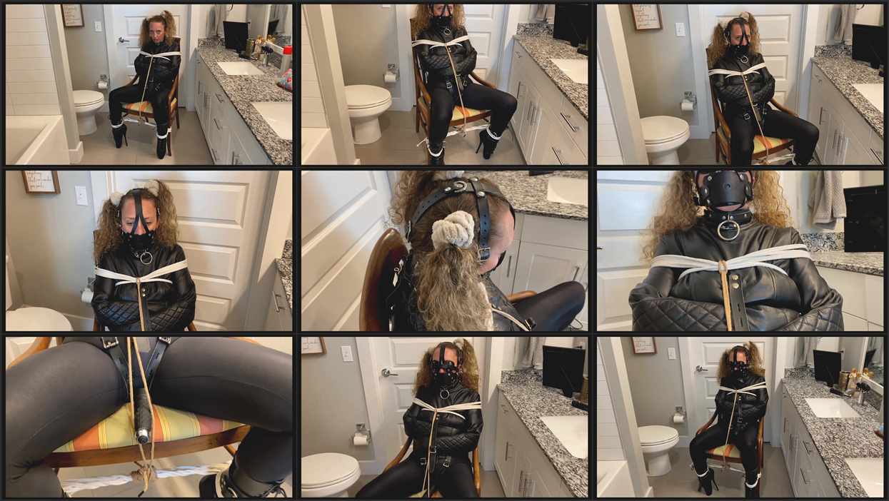 Grabbing drinks with my buddies used to be fun until I noticed my gal Taylor stalking us everywhere we went. She’ll hide in the bushes, or a behind a tree or a car, and it’s become a problem. Well tonight is another hangout and I decide enough is enough. I bait Taylor into believing that I’m shooting a dramatic scene for school that includes a straitjacket and rope restraints. I also tell her it would be fun to see her in our favorite fetish leather ballet boots tied up to the chair too. She takes the bait and in the process I gag her with a bandana stuffed inside her mouth, tape to keep it in and a leather head harness to make sure the neighbors won’t hear anything. Little does she know is that she’ll be spending the evening in it. When I come home later that night, I decide to reward her for her good behavior.