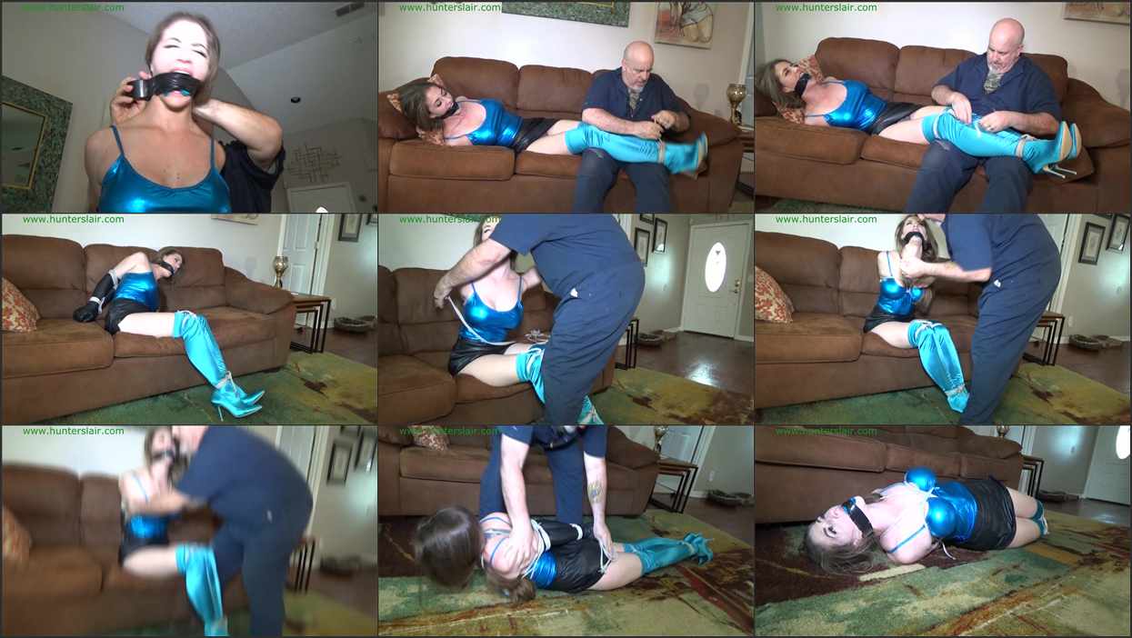 Busty Terra is dragged into the Hunter’s living room by her hair with her gloved elbows and wrists fused together behind her back in ropes. Terra bitches and complains as she demands that he let her go but the Hunter reaches into his pocket and pulls out a pair of satin panties and stuffs them into her big mouth. With her mouth packed he pulls out a roll of shiny black tape and pulls is between her teeth and wraps it tightly around her head packing the panties deep in her mouth and stifling her bitching and complaining. He then pushes her onto the sofa and grabs booted ankles and more rope. The ropes are wrapped tightly around her ankles and cinched tight. Then he binds her booted knees together and cinches them tight. Terra curses and protest through her gag as she is left strugggling helplessly on the sofa. The Hunter comes back with more rope and wraps the new rope around her shoulders, chest and arms framing her huge tits in rope. Then to her utter dismay he begins to wrap the ropes around the base of her big tits, Terra screams and protests as her poor tits are bound in the ropes until they begin to swell and bulge against the shiny fabric of her tank top. Her big tits look like two swollen blue balloons bound inside her top. The Hunter moves her to the floor and rolls her over onto her belly. Terra screams into her gag as she is XXXX to lie on her bound breasts as the Hunter ties a rope to her bound ankles and them pulls her legs up into a strict hogtie. Once she is hogtie he rolls her over onto her side satisfied that she won’t be rolling around much in fear of crushing her bound tits under her hogtied body again.