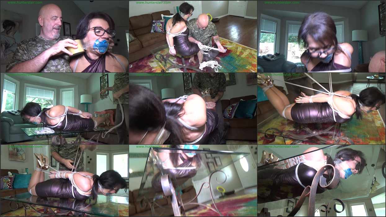 The Hunter has had enough of Gigi bitchy attitude and the time has come to give her a little attitude adjustment. With her arms fused tightly together behind her back he drags her into the living room. Gigi kicks, screams and curses as she demands that he untie her arms immediately. But he has had enough of her swearing and foul mouth so he pulls a pair of her panties out of his pocket and stuffs them into her big mouth. He then seals her mouth shut with layer of clear packing tape wrapped tightly around her head. Once she is gagged he pushes her onto the coffee table and binds her curvy legs tightly together with ropes wrapped tightly around her knees. He then rolls her onto her belly and ties her ankles tightly together with more rope. Another rope is tied between her bound stiletto heels then run up to her bound elbows. The Hunter pulls all the slack out of the hogtie rope pulling her heels to her hands then wraps the remainder of the rope up her forearms fusing her arms completely together behind her back. He leaves her alone to struggle and suffer in the brutally tight hogtie to think about adjusting her bitchy attitude.