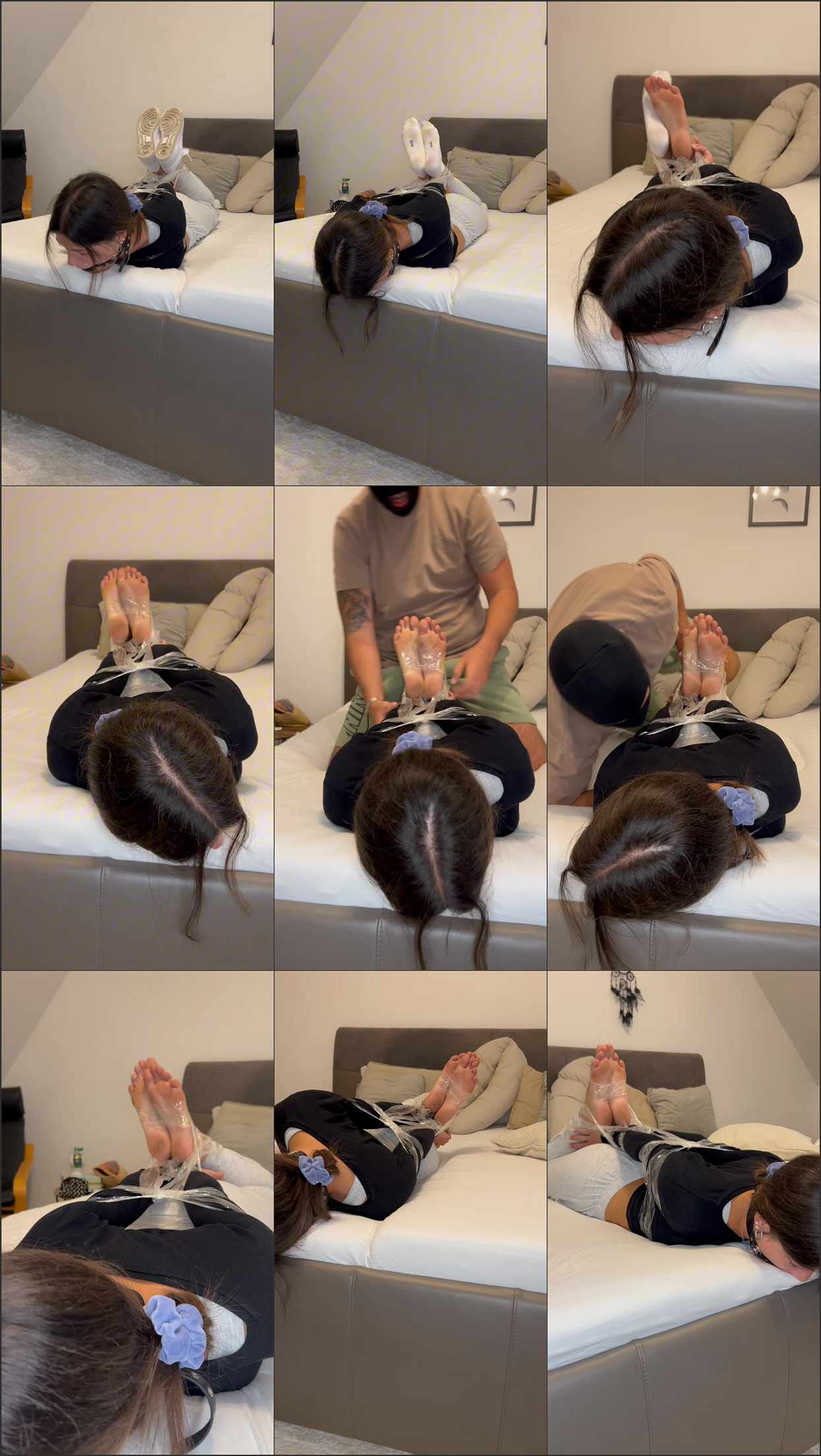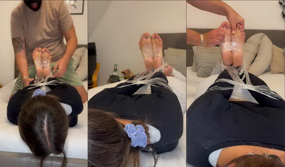 Today I’m bound with transparent tape and gagged with a ball gag. My perfect but slightly dirty soles are on full display and later tied together. He then licks my defenseless feet.